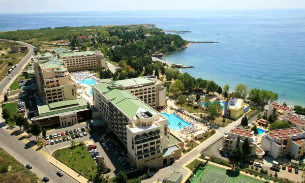 Imagine a quiet and stylish beachfront resort, embraced by a green park and lush gardens, next to a sandy beach! In one of the premier resorts on the Bulgarian Black Sea Coast. Designed so that kids have fun while parents relax. Aquapark, outdoor and indoor swimming pools, kids’ pools, tennis courts, volleyball,basketball and mini-football