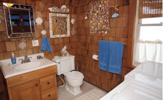 We loved the 1906 home with many ocean inspired decorations! The bedding and towels were clean without perfumed detergents and the kitchen well stocked with cooking gadgets.No spices or coffee filters, we left our filters for others.Awesome location, ease of check- in.Windows and mirrors could use a deep clean with a steam vacuum, as well as bathroom cedar.