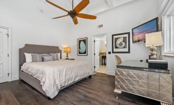 This luxurious 3-bedroom, 3-bathroom home is just steps from the beach. Newly remodeled from floor to ceiling. 2-story front house features a large master retreat with an en-suite bath, vaulted ceilings and an ocean-view deck. A gourmet kitchen perfectly appointed with commercial appliances. Private laundry, 2 car tandem carport parking that easily accommodates large vehicles, gated patio facing the morning sun. Wireless internet, advanced yet easy-to-use electronics, artful design lighting. The bath retreats feature spa fixtures and relaxing ambient lighting. Ample closet space in each room. Ceiling fans throughout.