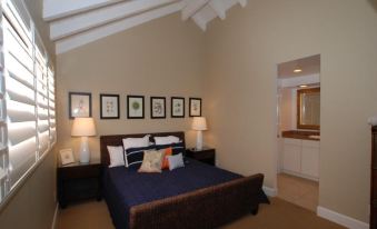 A king sleigh bed is the centerpiece of the master bedroom with an en suite bath and vaulted ceilings. An armoire hides the flat panel TV.