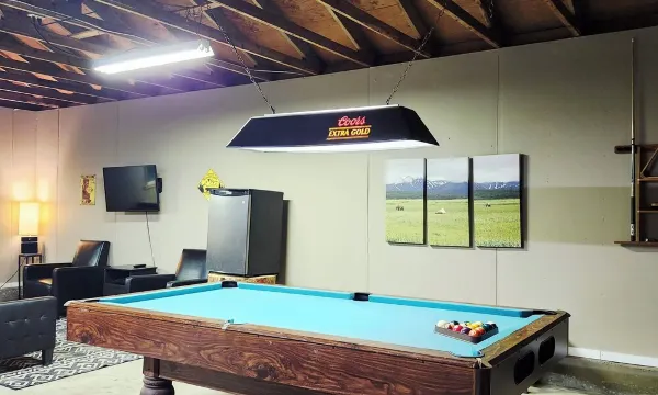 This cozy cabin retreat in North Fork has a big outdoor deck, out door BBQ. A full kitchen with a full size coffee maker. This amazing property features 3 bathrooms with 3 bedrooms - 2 king beds and 1 bunk bed. You could also use one of the folding twin bed and sofa bed in the living room. Each bedroom with a hair dryer + shower. The game room has a pool table, a poker table +more. Escape to this cool hideaway and unwind in style. Enjoy all that North Fork has to offer when you stay at our place.