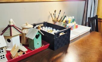 Huge deck and patio with outdoor dining, hot tub, & BBQ. Family cave garage with pool & poker tables, books, games, and bird house painting.