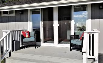 A dining/living room/bedroom all are located in an open concept room with large windows, overlooking the yard with panoramic views of the ocean and beautiful sunsets.