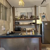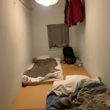 This is a hostel on the 2nd floor, on the 1st floor there is a restaurant and a bar, but they close at 11:00 PM, so you can sleep peacefully. There is nothing in the room except futons and air conditioning. The common areas are very clean, there is a shared kitchen. The toilet and shower are clean. Towels are paid, 200 yen. There is one free drink upon arrival, the receptionist is very nice and speaks good English.