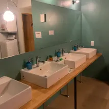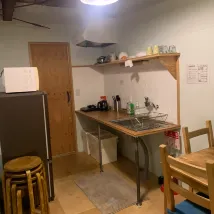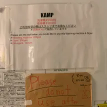 Nestled in a residential area, Kamp exudes an artsy vibe from afar. The reception area downstairs is a cafe offering drinks and meals, so residents can easily come down to enjoy coffee, work, or chat with the staff. I stayed in a side building, requiring a flight of stairs to reach the restrooms, but overall it was quite nice. There might be a bit limited space for packing luggage, and no lockers are provided. There's also a shared living room on the first floor for cooking and working. A welcome addition is the availability of washing machines and dryers. The staff were all very friendly and welcoming.