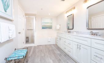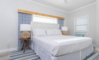 Indulge in relaxation in the master bedroom, boasting a king-size bed, private balcony access, and a large, updated master bathroom complete with a double vanity adorned with granite countertops and a walk-in shower with a glass door. The second bedroom offers another king-size bed, while the third bedroom boasts two queen-size beds, all beautifully decorated in coastal cottage decor.