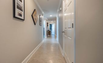 Open to the living room, the fully equipped kitchen features tons of white cabinetry, stainless steel appliances, and endless counter space for meal prep. The enormous breakfast bar at the kitchen island can seat up to 8 people, and the Gulfview dining table seats 8 guests as well. In the dining area, you’ll find an accompanying wet bar with an ice maker, sink, and open glass shelving, the perfect beverage station.