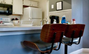 The living room boasts a SMART TV and two sofas. One huge brown leather couch, and a futon that turns into another bed! Giving you access to Netflix, HBO, etc and access to the free Wi-Fi. This will lead you into the dining area that can seat up to 8 people, perfect for entertaining. The condo itself has two bathrooms, one with a shower and the other has a tub. Temperature is controlled with the smart thermostat for your comfort and easy check in through our smart lock!