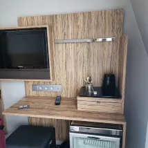 Nice decorations in the room, clean , small fridge, kettle, safe, good breakfast