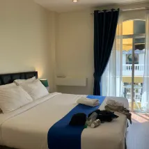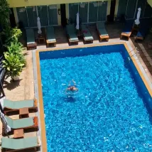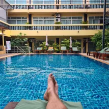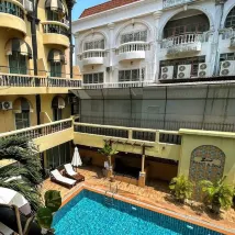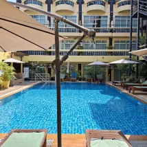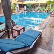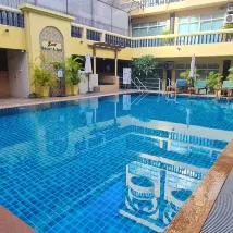 This is my second visit to this hotel, and both times I've stayed in the same deluxe room on the 4th floor, featuring a balcony and a pool view. I particularly appreciate its convenient location and the excellent, friendly staff. Housekeeping is daily, with complimentary tea, coffee, and water provided in the room, and the bed linen is changed frequently, which is a nice touch. The pool is clean and spacious. There's a library at the front desk with books in Russian. Nearby, you'll find a 7/11, a tuk-tuk stand, and a couple of cafes serving tasty, inexpensive food. The beach, blind massage, Jomtien Walking Street, and the bus station to the airport are all close by. On the downside, there's no full-length mirror and no hook for bath towels in the shower. I definitely recommend it!