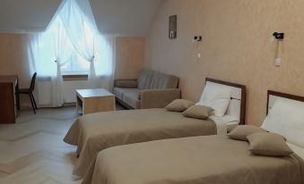 This is a new, equipped and modern, cozy three-storey building. On the ground floor there is a restaurant with a bar until 20.00. On the second and third floors there are 10 rooms for two guests with a full bathroom, floor heating and air conditioning, TV, internet, refrigerator, balcony. All rooms with a view of the Pskov lake. Clean air, pine forest enriches it with phytoncides. Quality beds with orthopedic mattresses. The rooms are equipped with stylish furniture, cozy and spacious - 27 square meters each.