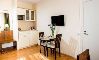 Отель в 5 минутах от набережной в тихом районе. Рядом есть пышечная, фермерская кондитерская, магазин продуктов и книжный магазин). Жили неделю.Из плюсов:при раннем въезде разрешили оставить чемоданы в ячейках до времени заселения.Бесплатно!Чисто и уютно в фойе и в коридоре.Ненавязчивая тихая музыка по всем коридорам. Номера отеля только на первом этаже, выше живут жители города. Хорошая входная группа, с высаженными и ухоженными растениями. Жили в самом большом номере 22, спальня-гостиная и кухня с большим диваном-лежанкой,это очень удобно! Есть микроволновка, чайник,посуда, холодильник.Есть сейф в шкафу. Кровать отличная,матрасы удобные, есть ролы на окнах,по вечерам задёргивали.Тв, стол, журнальный стол , раскладной диван, коврики! В ванной не хватило крючков для одежды, вернее их не было.Ванная большая , с большим душем.Для двуспальной кровати положили одно одеяло , и то которое не накрывало всю кровать, поэтому при использовании двумя людьми, одеяло перекачёвывало на одну сторону. ОЧень не удобно,не высыпаешься!!! Завтраки средние, но в целом всё есть.Каша, омлет,варёные яйца сосиськи /колбаски, сыр и колбаса одного вида.Хлеб чёрный и белый , тостер.Масло,джемы,молоко, йогурт, мюсли,выпечка.Чай в пакетах и Иван чай, и кофемашина, можно налить и капучино и латте и шоколад. С фруктами беда, всё невкусное, зелёное...Завтраки с 7-10. В Петрозаводске почти всегда идёт мелкий или не очень дождь.Отель предоставляет фирменные яркие зонтики-трости бесплатно!Супер.И , велики , тоже бесплатно.Уборка по вашей просьбе, каждый день номера не убирают.Персонал спокойный, их почти не видно и не слышно. В фойе есть полки с сувенирами и зона ожидания с гостевой книгой. В целом довольны! Но цены высоковаты для отеля с средним завтраком и с отсутствием каждодневной уборки..