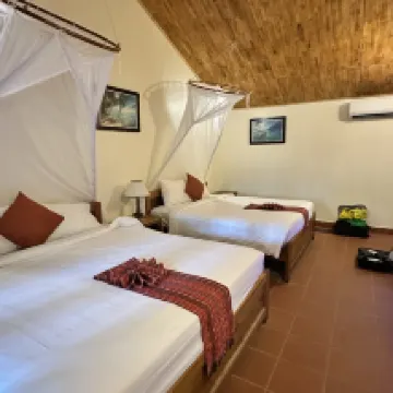 This place is located near King Kong, which is a great location. The advantages are high cost-performance, individual bungalows, decent rooms, and aromatherapy. The main point is the exceptionally high cost-performance! The disadvantage is that because of the good location, our room was close to the street, so there was some motorcycle noise. However, the noise level was acceptable and within normal driving noise. If you have trouble sleeping, you can note your preferences when booking. The cleanliness is so-so, but the breakfast is quite good – they just don't have rice noodles, haha. If you're on a budget, overall you'll find this place fantastic, especially since it's close to the airport.