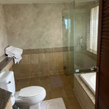 The room is spacious! Sometimes hotel rooms barely fit a bed, but this was completely different – you could practically dance in it! We had two rooms connected by a wide corridor that featured a built-in kitchen. The bathroom was large, with a roomy shower cabin, a bathtub, and a full-wall mirror – very convenient. All necessities were provided in the room, and there's a laundry service available on the hotel premises. Breakfasts were good and hearty.