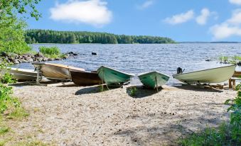 72 km north of Joensuu, Lake Pielinen 150 m (871,2 km²), common shore with sandy bottom, shore full of boats of the other cottages. Log cottage 2001, kitchen, living room, bedroom with double bed, upstairs bedroom with double bed and one bed, and sleeping gallery with one bed, sauna (elec. stove), terrace and balcony.