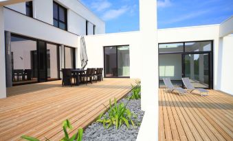 Une magnifique maison spacieuse et très bien équipée. Des extérieurs très bien aménagés. Une piscine couverte, chauffée superbe. Un propriétaire très sympathique et à l'écoute de toutes vos questions. Des équipements (vélos, kayac de mer, ...) à disposition. La plage à 100m.