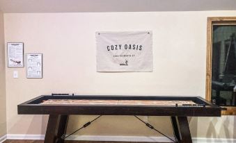 Chic modern, and newly renovated cozy interior with electric fireplace, large comfy sectional, a shuffleboard, TV, record player and panoramic lakefront views
