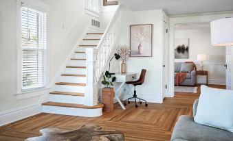 The first floor of this magnificent home features a fold-out sofa sleeper with an en-suite full bathroom, providing additional sleeping arrangements for larger groups. Here, your family members can unwind after a day of exploration or use it as a cozy space to relax and enjoy a movie night together.