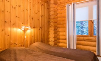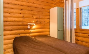 Cosy row house of massive logs, built in 2000. Roomy living room and kitchenette, with a sofa bed, fire place room with and a sofa bed, sauna, 2 WC’s, storage room, and terrace. 3 bedrooms with 2 beds in each.