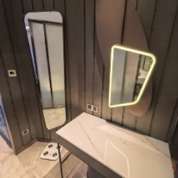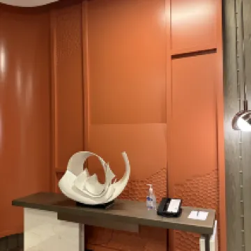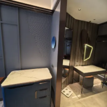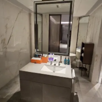 On the positive side, the room and restaurant service are good. The hotel has only been open for a few years, so the facilities are still relatively new. The room size is decent, and the layout is well-designed with a separate vanity area. The cleanliness is also good, and the toiletries are of acceptable quality. The hot water is excellent, with high temperature and strong pressure. The decor is quite distinctive; the hotel elevators and the wall behind the bed feature a faux-leather, hand-stitched design.