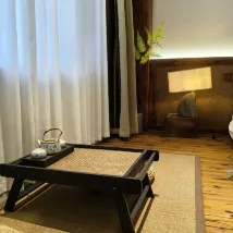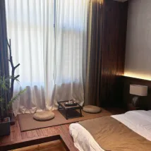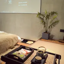 The tatami mattress is incredibly comfortable, perfect for unwinding after a day of exploring. The spacious room includes a tea-making area, sofa area, bed, bathroom area, and a huge projection screen, so you can enjoy your favorite movies anytime. The tea area is richly decorated with Minnan cultural touches and thoughtfully equipped with tea sets and Minnan pastries. The bathroom features a separate wet and dry area, fully stocked with daily essentials and disposable amenities for enhanced cleanliness.