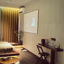 Our 'Muxu' room type is a spacious Tatami cinema room with a king-size bed. It comes fully equipped with a sofa, coffee table, 24-hour hot water shower, and a private bathroom. Plus, the projector supports screen mirroring from your phone! 📱