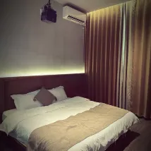✔️ The room's lighting is warm-toned, and after a day of sightseeing, it was pure bliss to lie in bed with friends and watch something on the huge projector screen! 🥰🥰