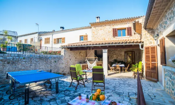 Mancor de la Vall: Very large, beautiful house "Son Trobat", 2 storeys, renovated. In a central, quiet position, 900 m from the edge of the forest, 30 km from the sea. Private: outdoor shower, table tennis, arbour, pergola, terrace, garden furniture, barbecue. In the house: internet access, WiFi, table tennis, storage room for bicycles, air conditioning, burglar alarm system, washing machine, tumble dryer. Public car park, public parking on the road. Grocery 150 m, supermarket 300 m, shopping centre 20 km, restaurant, bar 50 m, bakery 100 m, pub garden 50 m, bus stop 300 m, sandy beach "Port Alcudia" 30 km. Sports harbour 32 km, golf course (18 hole) 30 km, tennis 500 m, riding stable 2.5 km, walking paths from the house, cycle lane 900 m. Nearby attractions: Monasterio de Santa Llucia 1.5 km, Monasterio de Lluc. Hiking paths: Puig de Santa Llucia - Biniarroi, Puig de Massanella, Lluc - Serra de Tramuntana. Please note: suitable for families, suitable for seniors. Object suitable for 8 adults. Loading and unloading of baggage is possible at the holiday house. Airfield 50 km from the property. "Son Trobat", 7-room house 300 m2 on 2 levels. Object suitable for 8 adults. Spacious and bright, fully renovated, very comfortable and tasteful furnishings: large living room with panoramic window with open-hearth fireplace, satellite TV, digital TV, flat screen and wood-burning stove. Exit to the terrace. 1 large double bedroom with panoramic window with 1 french bed (180 cm, length 200 cm), wood-burning stove. Lounge with panoramic window. Kitchen-/living room 50 m2 (oven, dishwasher, 3 ceramic glass hob hotplates, toaster, kettle, microwave, freezer, electric coffee machine) with bar, dining table, air conditioning and forced-air heating. Exit to the terrace. Bath/shower/bidet/WC. Upper floor: 1 large double bedroom with panoramic window Dressing room with 1 french bed (150 cm, length 200 cm), wood-burning stove, air conditioning and forced-air heating. 1 double bedroom with panoramic window with 1 french bed (140 cm, length 200 cm), TV and wood-burning stove with 2 beds (90 cm, length 200 cm). Bath/shower/bidet/WC, double hand-basin, hydro massage bath. Large terrace, porch. Terrace furniture, barbecue, covered balcony, sitting area, box-room. View of the resort. Facilities: washing machine, dryer, iron, baby cot for up to 2 year olds, hair dryer. Internet (WiFi, free). Suitable for families. ETV13338 ESFCTU0000070220000675270000000000000000000ETV/133388