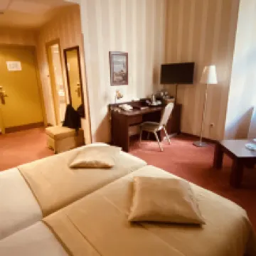 The hotel left a good impression. Clean and cozy. Friendly staff, great location, food is delicious and varied