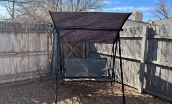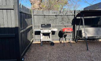 One of two attached studios. It’s tucked away in a great neighborhood, it’s peaceful and private. It has a comfortable queen bed with fresh linens and a futon that makes into a queen bed. It has a full bath and a well stocked kitchenette. The private fenced yard has a dining table and chairs and a charcoal grill. It’s very close to the hospital, shopping, downtown and restaurants.