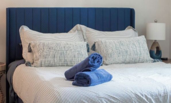Spacious queen-sized bedroom with luxe linens.