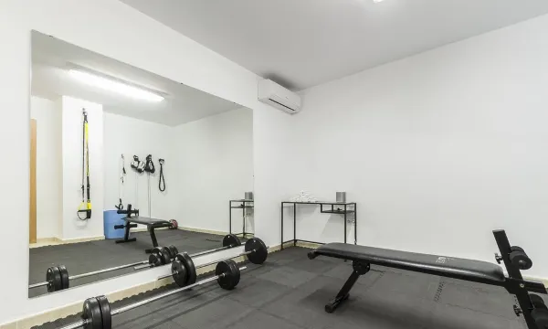 On the next floor there are two bedrooms with two single beds (0.90 m x 2 m) that are next to each other. Here you will also find a bathroom with a rain shower. You also have a beautiful view from these bedrooms. On this floor there is also a room with washing machine and dryer. To keep fit during your vacation you can use the gym where you can lift weights (kettlebells, barbells, dumbbells and bench), Pilates balls, TRX tires, jump ropes and boxing gloves. From this floor you have access to another terrace where there is a small garden around the house where you can barbecue.