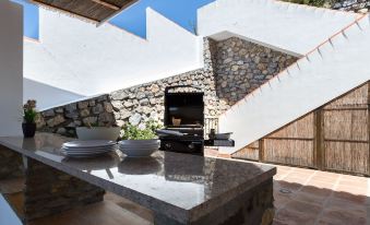 Villa Amani has three bedrooms, two of them are fitted with en-suite bathrooms, all bedrooms suitable for double occupancy. There is the possibility of using two extra single beds. Therefore, in total, the villa can accommodate up to eight guests. The entrance gives access to the living room with a cozy fire place. The living room has wide windows facing the incredible views to the spectacular surroundings. Just a few steps, you find the dining area and the kitchen which is equipped for all your culinary needs. You can prepare delicious meals on the gas barbecue located in one of the terraces.