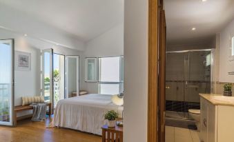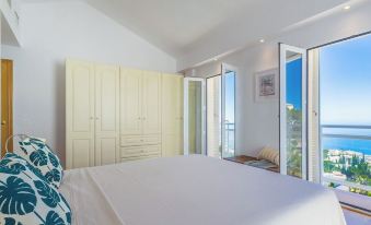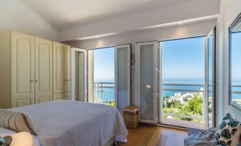 Three of the bedrooms are located on the top floor, one of which is the master bedroom with en-suite bathroom. The other two bedrooms share a family bathroom. Two bedrooms have a double bed (1.50 m x 2 m) and one bedroom has two single beds (0.9 m x 2 m). Two bedrooms have direct sea views. The fourth bedroom with two single beds (0.90 m x 2 m) is on the lower floor and is part of a separate, spacious apartment with its own kitchen, bathroom and direct access to the pool deck.