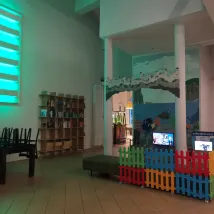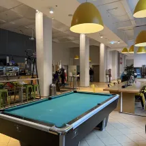 Big lobby area with lot of seats and places for dining. Kitchen a a bit snall and stuffy.