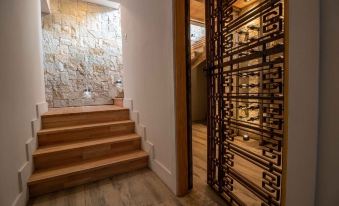 * A downstairs living area on the third floor that consists of 4 bunk-bed style beds, a wood-burning fireplace, and a mini kitchen with access to the garden and patio.