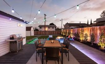 Outside is where this place really shines: the backyard has a hot tub, gas fire pit, outdoor dining, lounge seating, and gated parking for two cars. There’s ambient lighting and built-in speakers for evenings under the stars.