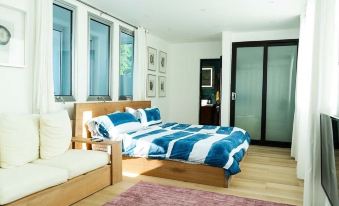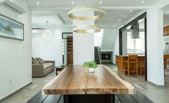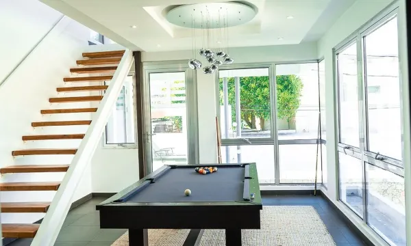The modern interior boasts Italian-imported porcelain tiles, triple-pane soundproof windows for coolness and quiet, and solid teak cabinetry handmade for the kitchen and bathrooms. High-end European fixtures add a touch of elegance. The massive kitchen island is perfect for gathering, and the second-floor lounge includes a pool table for entertainment. Furniture is from Pottery Barn, West Elm, or custom-made.