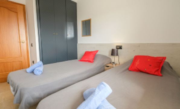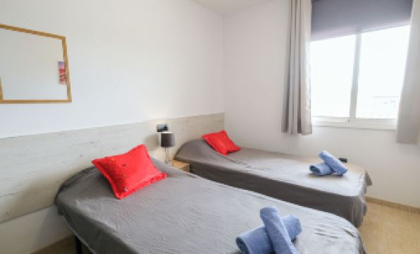 Golden Beach: Modern apartment block "Golden Beach". On the outskirts, 800 m from the centre of Sant Carles de la Rapita, 300 m from the sea, from the beach. For shared use: with lawn, beautiful garden to relax, swimming pool (seasonal availability: 01.Apr. - 30.Oct.). Children's pool, outdoor shower, table tennis, patio, children's playground, pool maintenance by the owner/gardener. In the house: lift. Communal covered parking space n 16. Shop 400 m, grocery, supermarket 400 m, shopping centre, restaurant 200 m, bar 300 m, bakery 400 m, café 200 m, internet café 300 m, pedestrian zone 10 m, bicycle rental 1 km, 15 minute walk to the centre, bus stop "Las Delicies" 300 m, railway station "L'Aldea" 20 km, sandy beach "Playa de les Delicies", diving center 500 m, outdoor swimming pool 1 km, indoor swimming pool 500 m, thermal baths "Montbrio del Camp" 60 km. Sports harbour 500 m, marina, golf course (18 hole) 30 km, surf school, sailing school, tennis, riding stable 12 km, sports centre 800 m, children's playground 500 m, fishing possibilities. Nearby attractions: Parque Natural del Delta de l'Ebre 20 km, Port Aventura Salou 80 km, Castillo de Peñiscola 40 km, Vinaroz 25 km. Hiking paths: La Foradada Sant Carles de la Rapita 3 km. "Golden Beach", 3-room apartment 68 m2. Comfortable and cosy furnishings: living/dining room with digital TV and air conditioning. Exit to the balcony. 1 room with 1 french bed (1 x 150 cm, length 190 cm), air conditioning. Exit to the balcony. 1 room with 2 beds (90 cm, length 190 cm), air conditioning. Kitchen (oven, dishwasher, 4 ceramic glass hob hotplates, kettle, freezer, grill, electric coffee machine) with digital TV. Bath/bidet/WC, shower/WC. Air-conditioning, forced-air heating. Balcony furniture. Distant view of the sea. Facilities: iron, hair dryer. HUTTE-067246 // Reg. Nr.: ESFCTU0000430100006219260000000000000000HUTTE-0672464