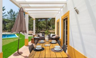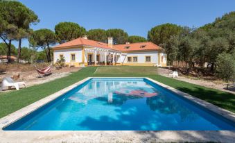 Large, luxurious "rustico" cottage "Refúgio no Montalvo". 102 houses in the resort. 14 km from the centre of Alcácer do Sal, 14 km from the centre of Comporta, in a secluded, quiet position, 16 km from the sea, 16 km from the beach, 1.6 km from the river, in the countryside, in the woods. For shared use: property 997 ha (fenced). Tennis (2 x hard court) (extra), basketball (extra), children's playground. Private: property (fenced), swimming pool angular (5 x 10 m, depth 110 - 190 cm, seasonal availability: 01.Jan. - 31.Dec.). Outdoor shower. In the complex: reception, restaurant, WiFi, air conditioning, washing machine. Parking on the premises. Supermarket 2 km, restaurant 2 km, bus stop 15.1 km, sandy beach "Praia da Comporta" 16 km, lake Herdade de Montalvo 50 m. Marina 31 km, golf course (18 hole) 30 km, tennis, riding stable, walking paths from the house 50 m. Nearby attractions: Comporta 16.2 km, Praia fluvial, da comporta 9.3 km, Estação Arqueológica de Abul 35.8 km, Tróia 30.1 km, Alcácer do Sal 14.4 km, Viveiro Florestal da Mata Nacional 16.8 km. Please note: car recommended. Suitable for families. 24hr guard. "Refuge", 4-room villa 160 m2. Very cosy furnishings: living room with cable TV. 2 rooms, each room with 1 french bed (160 cm, length 200 cm), air conditioning and forced-air heating. 1 room with 2 beds (90 cm, length 200 cm), air conditioning and forced-air heating. Kitchen (4 hot plates, oven, dishwasher, microwave, freezer, electric coffee machine, Capsules for coffee machine (nespresso not incl)). 3 bathrooms. Upper floor: open sleeping alcove with sloping ceilings with 1 french bed (160 cm, length 200 cm). Terrace furniture, barbecue, sitting area. View of the swimming pool and the garden. Facilities: washing machine, iron, children's high chair, baby cot for up to 2 year olds, hair dryer. Internet (WiFi, free). Parking at the house. Please note: suitable for families. Fire extinguisher. Instead of an enclosed bedroom, some sleeping areas are located in an open-plan area (gallery, alcove, etc.). 89/AL