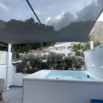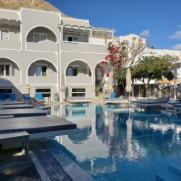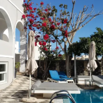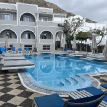 The hotel is about a 10-minute drive from the airport. It's also just a 2-minute walk to the main street for shopping and dining, as well as to the black sand beach. So, the location is quite convenient. However, the bathroom had a slight odor, and there was no shower screen, meaning the entire bathroom floor would get wet after each shower. Perhaps that's typical for some European hotels. Our room overlooked the swimming pool, which was very handy.