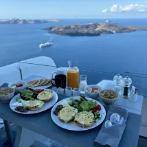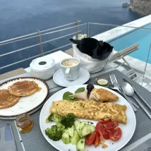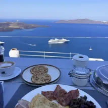 At the Cliff Hotel, it was a truly relaxing experience to sit on the terrace outside my room in the morning, listening to the seagulls circling and playing, and watching the morning glow paint the white walls. Below, the azure blue of the Aegean Sea was calm and profound. The waiter served breakfast on the terrace outside each room. It was a truly wonderful experience. My only regret was that I only stayed for one day; I recommend planning at least two nights.