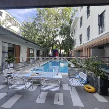 The hotel is small, but very clean, and the facilities are quite new. There is billiards to play in the backyard, and the swimming pool is also in the backyard. The environment is really good.