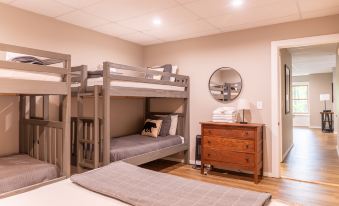 Downstairs: "The Wolves Den"; bedroom, a homage to NC State and the city of Raleigh. This room has a Queen bed and two sets of Twin/Twin bunks and there is a full bath down the hall with a shower.