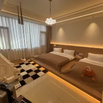 The room was incredibly clean and tidy, and the warm ambient lighting created a truly delightful atmosphere. Our two children absolutely loved the swing and various toys in the room and had a blast playing with them. The host was exceptionally welcoming and friendly, even providing us with a complimentary electric scooter to ride to the scenic spots.