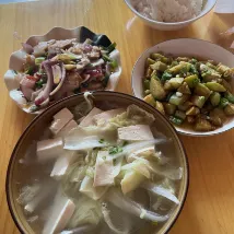 We enjoyed a mountain view from the window. For breakfast, we had noodles and rice noodles.