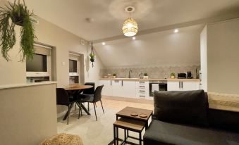 The fully equipped kitchen includes modern appliances such as a washing machine, full-height fridge freezer, dishwasher, electric oven and hob, microwave, kettle, and toaster. You'll find everything you need to prepare meals, along with a dining table that seats four. This Boho apartment combines style and functionality, ensuring you have everything you need for a comfortable and enjoyable stay.