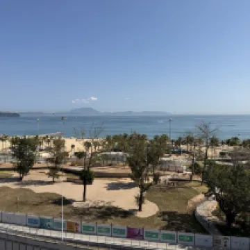 The location is super convenient, right at the subway exit. It's just across the street from the beach, and our sea-view room was perfectly centered with an unbeatable view of the beach.