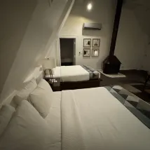The room is quite spacious, with two large beds upstairs and downstairs. The house is old and made of wood.