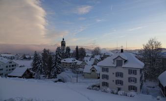 The 4-room apartment in the “Haus zur Rose” is located in the village center of Speicher, elevated and with a beautiful view of the village and the extensive Appenzellerland.